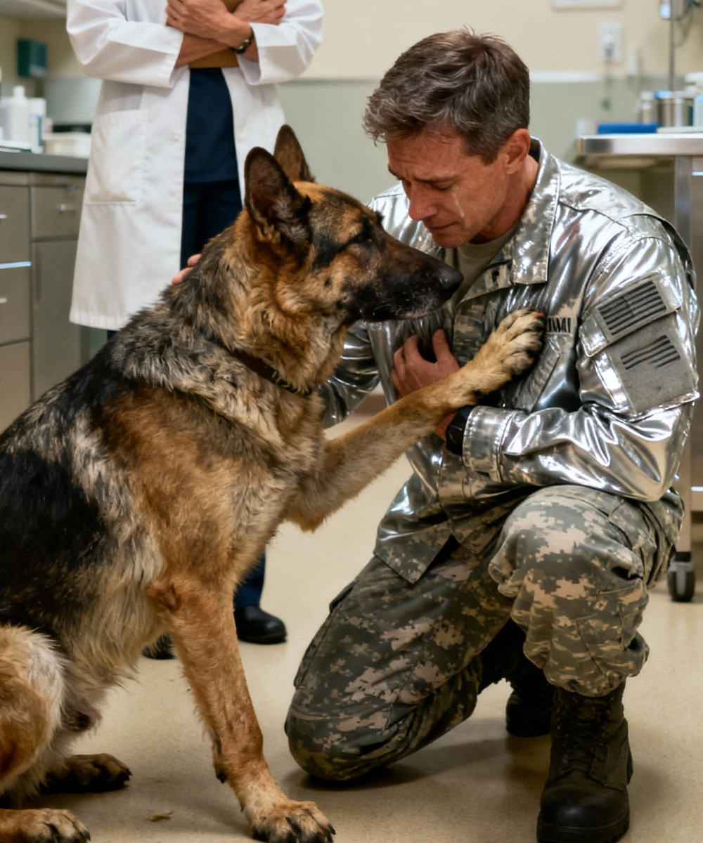 Rain brushed softly against the clinic windows while the sharp scent of disinfectant lingered in the still air. Staff Sergeant Marcus Chen stepped inside carrying Rex, his eleven-year-old German Shepherd wrapped in a faded military blanket. Once strong and tireless, the dog now felt impossibly light in his arms—years of courage and loyalty reduced to a fragile frame.
