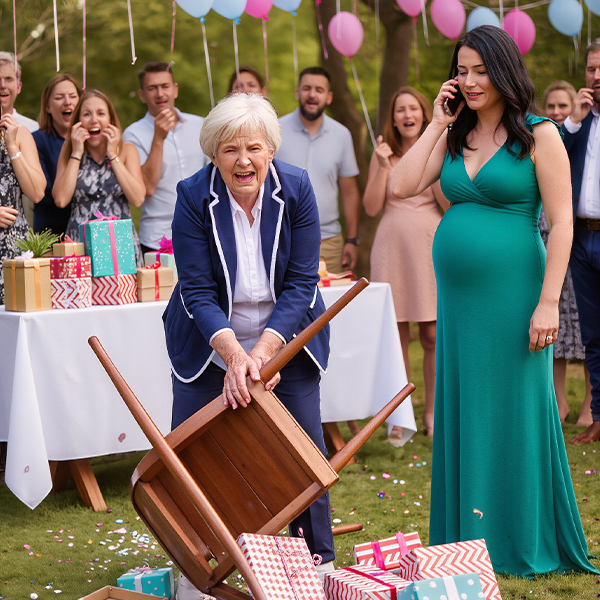 The party was at its happiest when a delivery man arrived carrying a massive golden basket wrapped in shimmering plastic. It glittered in the sunlight like something from a luxury catalog — designer baby clothes, silver rattles, monogrammed blankets.