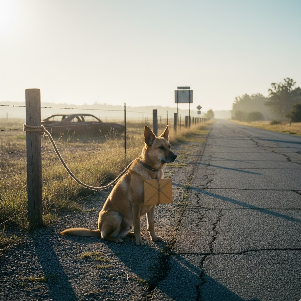 Halfway down the deserted stretch of Maple Street, I noticed something strange near an old, fenced-off lot — a tan dog tied to a post. It wasn’t barking or pacing. It just sat there, still and alert, its golden eyes tracking the horizon as if waiting for someone to arrive.