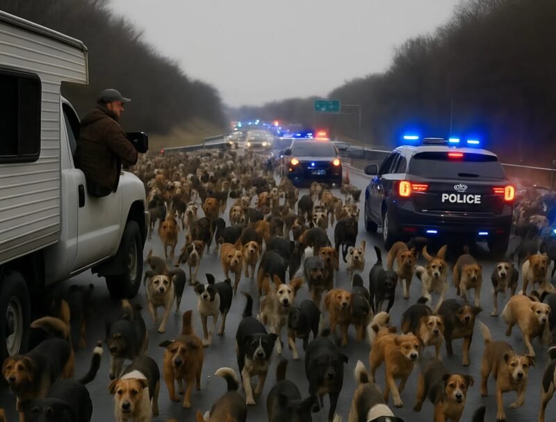 Hundreds of dogs suddenly spilled onto the highway, bringing traffic to a complete standstill. Police and rescue teams struggled for hours to clear the road, unable to understand where so many animals had come from — and when the truth finally emerged, it shocked everyone.