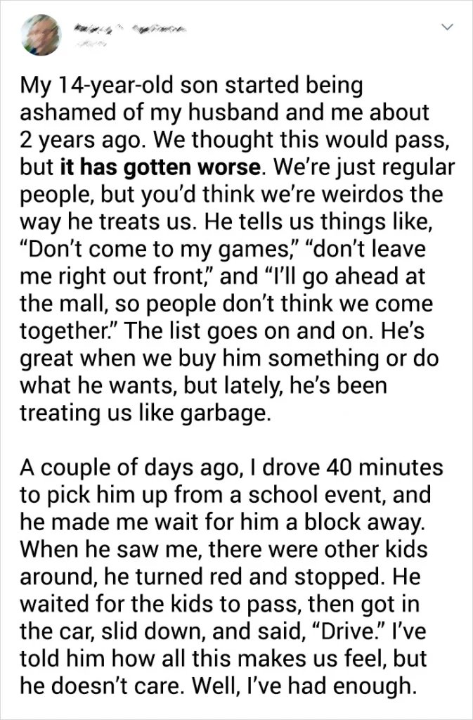 One mother shared her experience of her son’s embarrassment toward her and her husband. He refused to be seen with them and even requested to be dropped off a block away from his destination to avoid his friends seeing his parents giving him a ride.